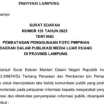 Pemprov Lampung Batasi Penggunaan Foto Pejabat di Media Luar RuangBandar Lampung|Oktober 15, 2025oleh Today2Bandar Lampung : Pemerintah Provinsi (Pemprov) Lampung menerapkan kebijakan pembatasan penggunaan foto