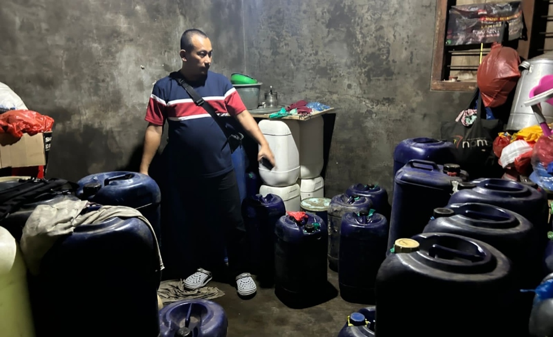 Di lokasi, polisi mendapati puluhan jeriken berisi Pertalite yang diduga telah dioplos, lengkap dengan berbagai peralatan pendukung seperti selang, corong, hingga alat takar dan timbangan.