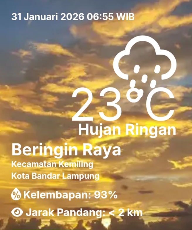 BMKG mengeluarkan peringatan dini hujan dengan intensitas sedang hingga lebat yang dapat disertai petir dan angin kencang, terutama di wilayah Bandar Lampung, Lampung Selatan, Lampung Timur, Lampung Tengah, Lampung Utara, Pesawaran, Pringsewu, Tanggamus, Lampung Barat, Pesisir Barat, Way Kanan, Mesuji, Metro, dan Tulang Bawang.