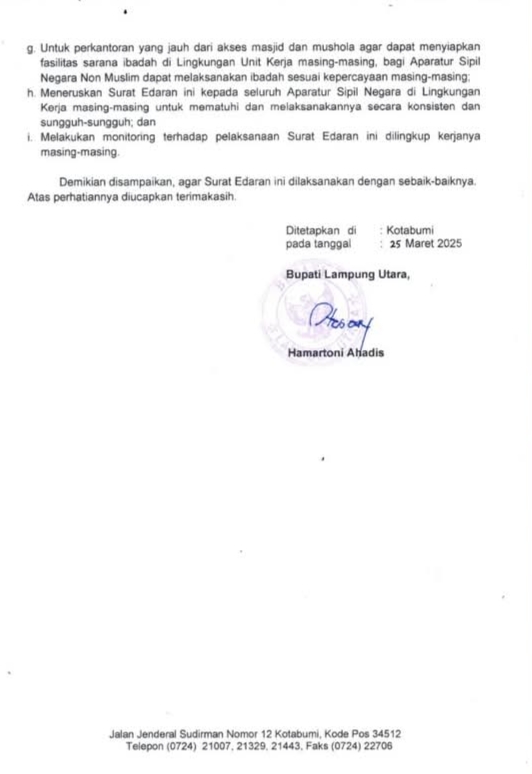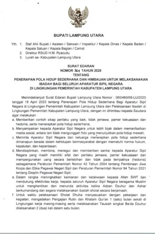 Lampung Utara: Bupati Lampung Utara, Hamartoni Ahadis, mengeluarkan surat edaran bernomor 364 Tahun 2025 pentingnya pola hidup sederhana serta pelaksanaan ibadah bagi Aparatur Sipil Negara (ASN) di lingkungan Pemerintah Kabupaten Lampung Utara.