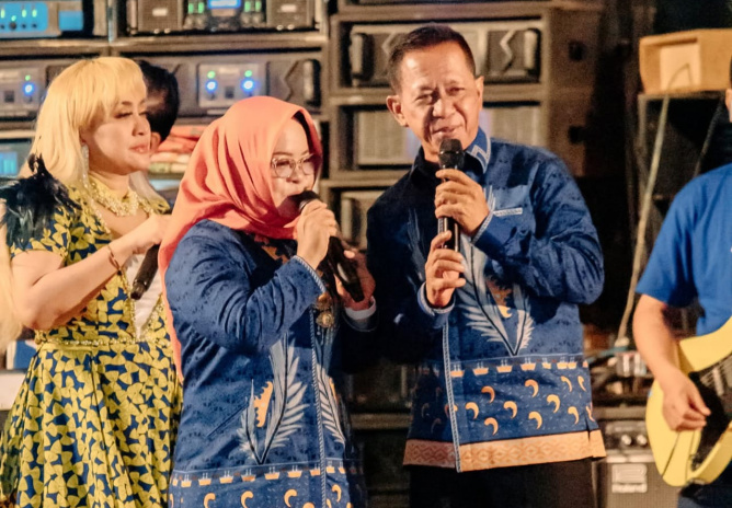 Dengan balutan busana senada bercorak biru, duet lagu dangdut idaman “Jangan Tinggalkan Aku” dari keduanya sontak menyambut suasana haru bahagia. Para pejabat, tamu undangan, dan ribuan masyarakat yang antusias ikut berjoget bersama, seakan menyatu menambah kehangatan kemeriahan malam puncak pesta rakyat.