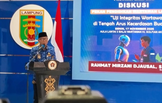 Dukungan itu disampaikan gubernur saat membuka Pekan Pendidikan Wartawan Lampung di Balai Wartawan Hi Solfian Akhmad, Senin (17-11-2025).