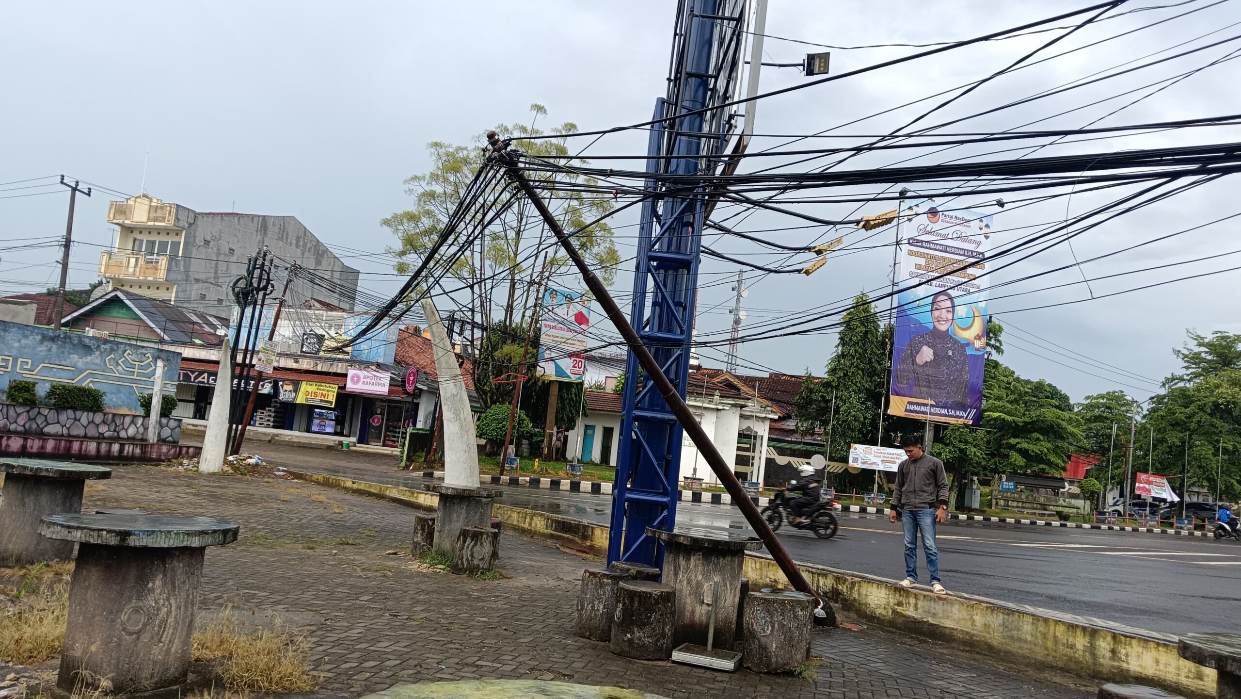 Selain berpotensi mencelakai pejalan kaki dan pengendara, kabel yang menggantung semrawut juga merusak estetika kawasan taman yang selama ini menjadi salah satu ruang publik favorit warga Kotabumi.