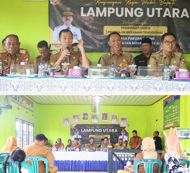 LAMPUNG UTARA : Pemerintah Kabupaten Lampung Utara terus mendorong penguatan UMKM berbasis budaya sebagai strategi pembangunan ekonomi sekaligus pelestarian identitas daerah. Upaya tersebut diwujudkan melalui kegiatan pembinaan UMKM dan pelestarian kerajinan tradisional yang dipimpin Wakil Bupati Lampung Utara Romli, di Kampung Tua Pakuan Agung, Kecamatan Muara Sungkai, Senin (15/12/2025).