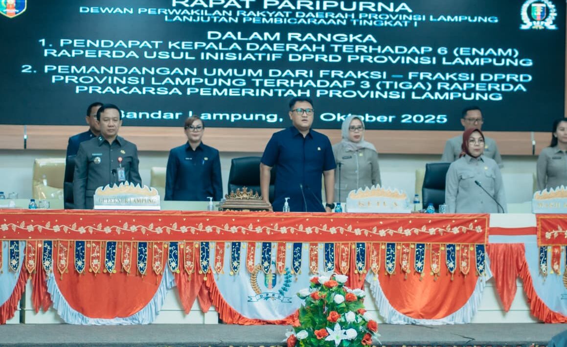 BANDAR LAMPUNG : Pemerintah Provinsi Lampung menyatakan setuju melanjutkan pembahasan enam Rancangan Peraturan Daerah (Raperda) usul inisiatif DPRD Provinsi Lampung. Pendapat resmi pemerintah itu disampaikan Sekretaris Daerah Provinsi Lampung, Marindo Kurniawan, dalam Rapat Paripurna DPRD di Ruang Sidang Utama, Kamis (9/10/2025).