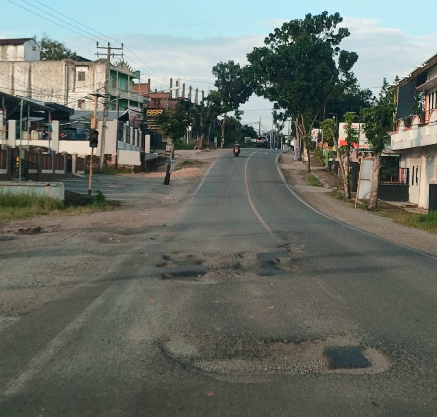 Lubang-lubang dengan ukuran bervariasi, dari kecil hingga besar, tampak menganga di badan jalan. Kondisi serupa juga ditemukan di ruas Lintas Sumatera yang melintasi delapan kecamatan di Lampura.
