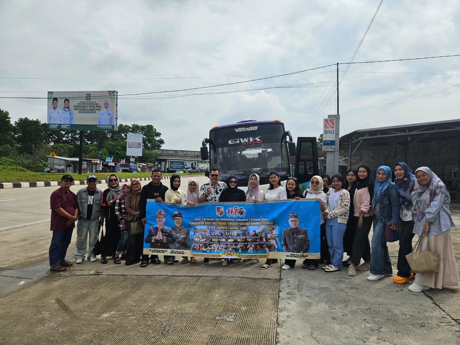 Lampung Utara: Tim penari Tari Bedayo Abung Siwo Migo dari Kabupaten Lampung Utara bertolak ke Serang, Provinsi Banten, Sabtu (7/2/2026) pagi, untuk ambil bagian dalam rangkaian Hari Pers Nasional (HPN) 2026. Rombongan dipimpin langsung Kepala Dinas Pariwisata dan Kebudayaan Lampung Utara, Perdana Putra.