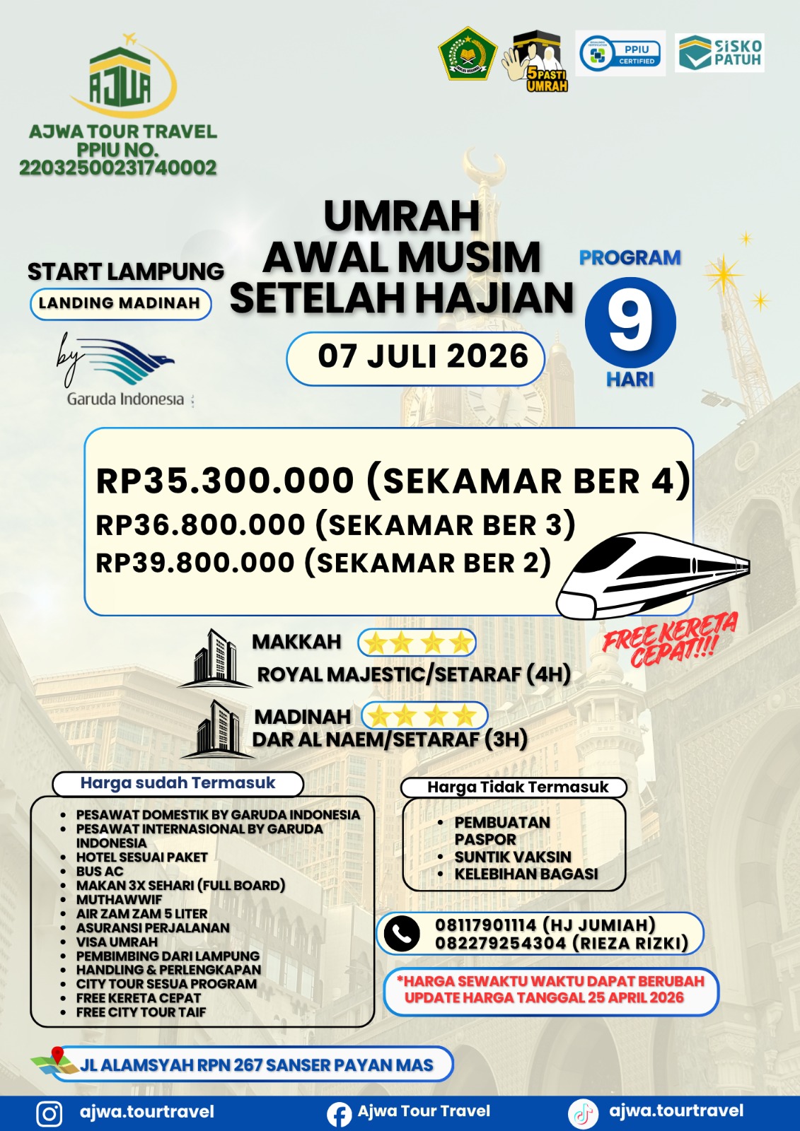 Owner Ajwa Tour & Travek Hj.Jumiah mengatakan program umrah ini berdurasi sembilan hari dengan rute keberangkatan dari Lampung dan mendarat di Madinah. “Maskapai yang digunakan adalah Garuda Indonesia untuk penerbangan domestik maupun internasional, ” ujar Hj.Jumiah, Sabtu (25/4/2026).
