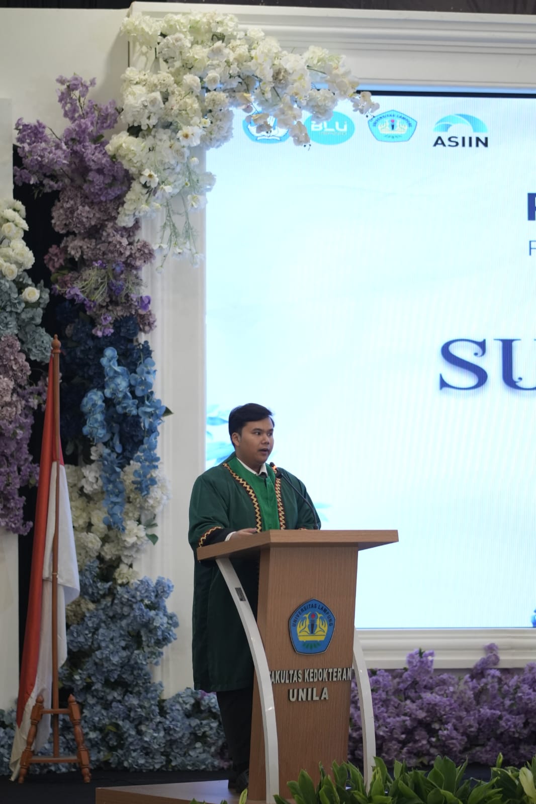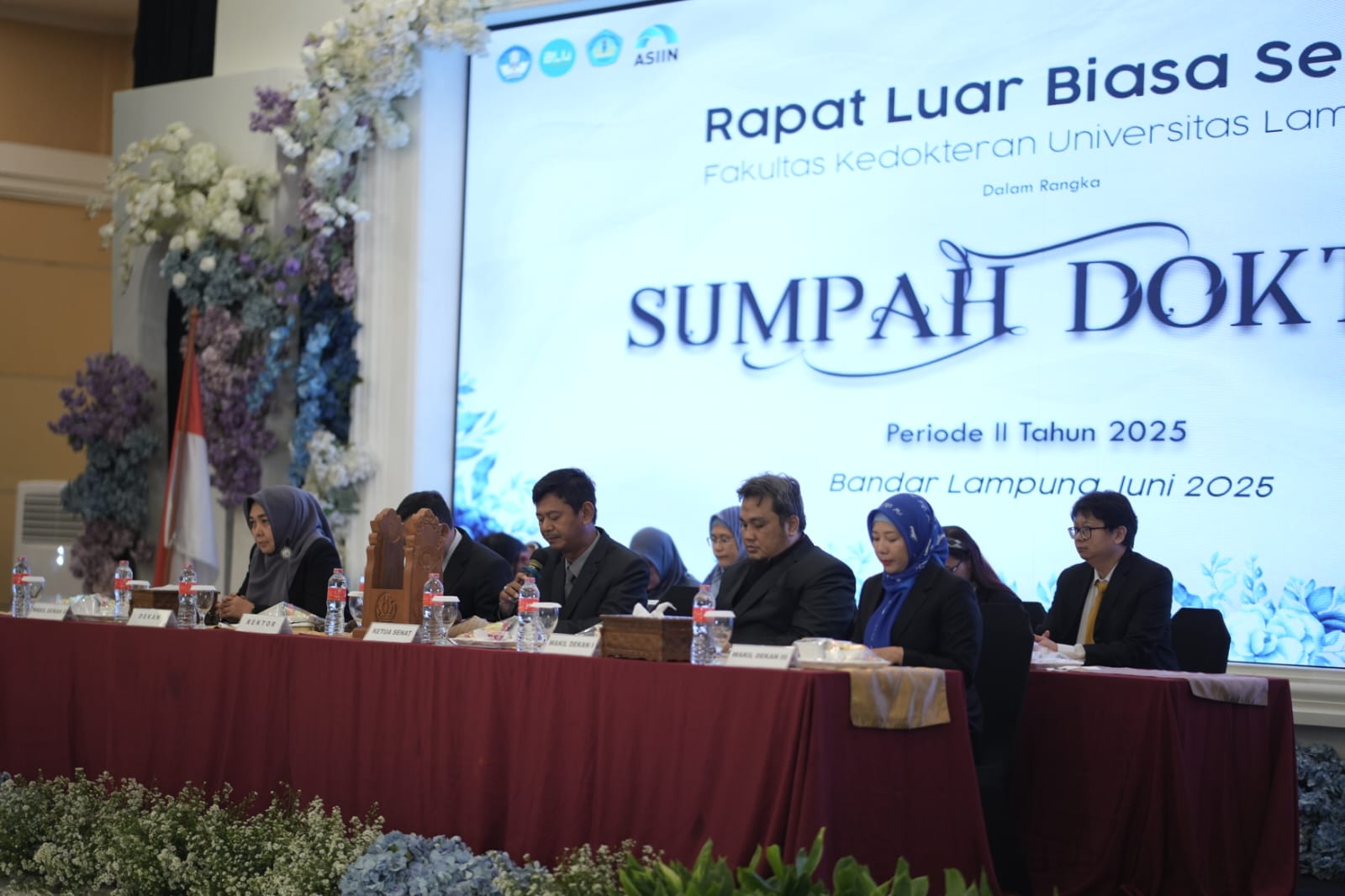 Pengambilan sumpah para dokter baru tersebut dipimpin dan dibuka oleh ketua Senat Fakultas Kedokteran Unila, Prof.Dr.dr. Asep Sukohar, M.Kes., Sp. KKLP