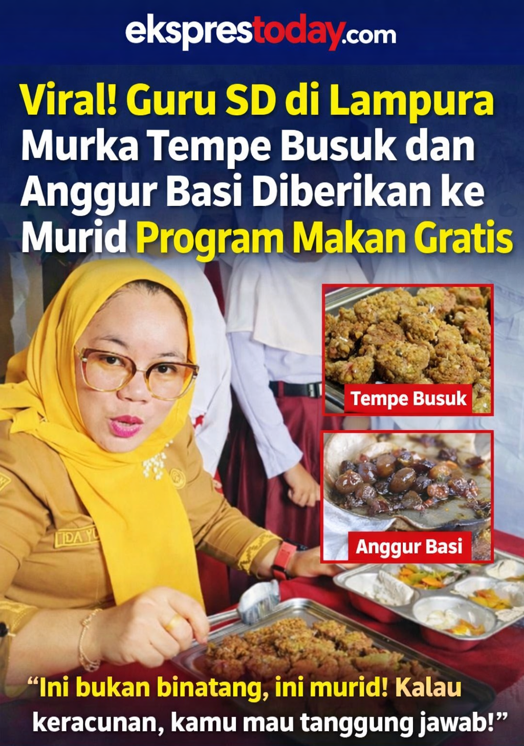 “Apa tanggapan kamu ngasih tempe-tempe busuk, ngasih anggur busuk? Ini bukan binatang, ini anak sekolah. Kalau murid kami keracunan, apa kamu mau tanggung jawab?” ucapnya tegas.