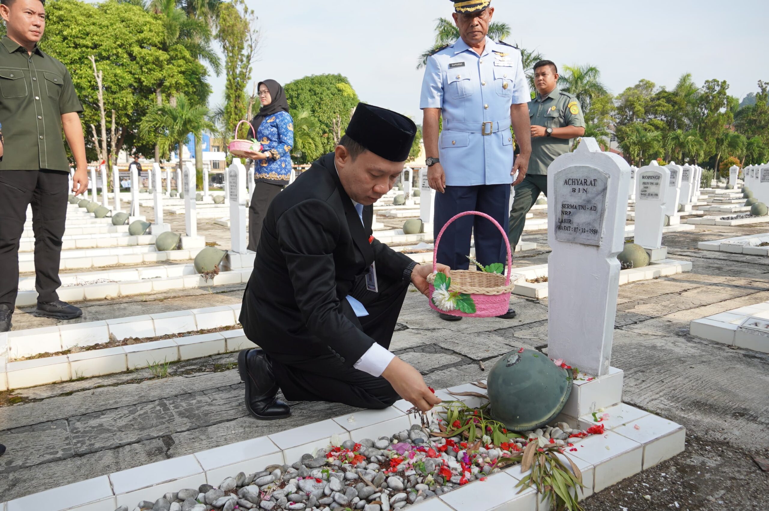 Sekdaprov memimpin langsung ziarah rombongan yang diawali dengan peletakan karangan bunga di tugu makam pahlawan sebagai bentuk penghormatan dan dilanjutkan dengan tabur bunga di pusara para pahlawan.
